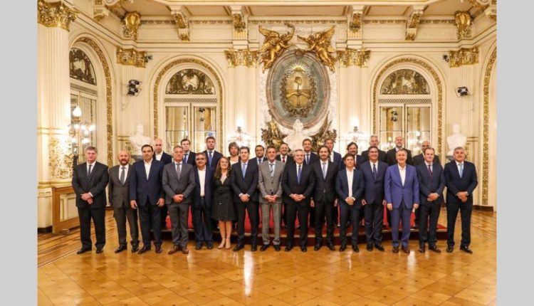 El Salón Eva Perón de la Casa Rosada fue el escenario de la primera foto que Alberto Fernández se sacó hoy con los gobernadores de todas las provincias argentinas, que acordaron con el Gobierno la suspensión por un año del consenso fiscal firmado hace dos años. Excepto el gobernador de Tierra del Fuego, que hoy asumió sus funciones, la asistencia fue perfecta: fueron 23 gobernadores de los distintos signos políticos.