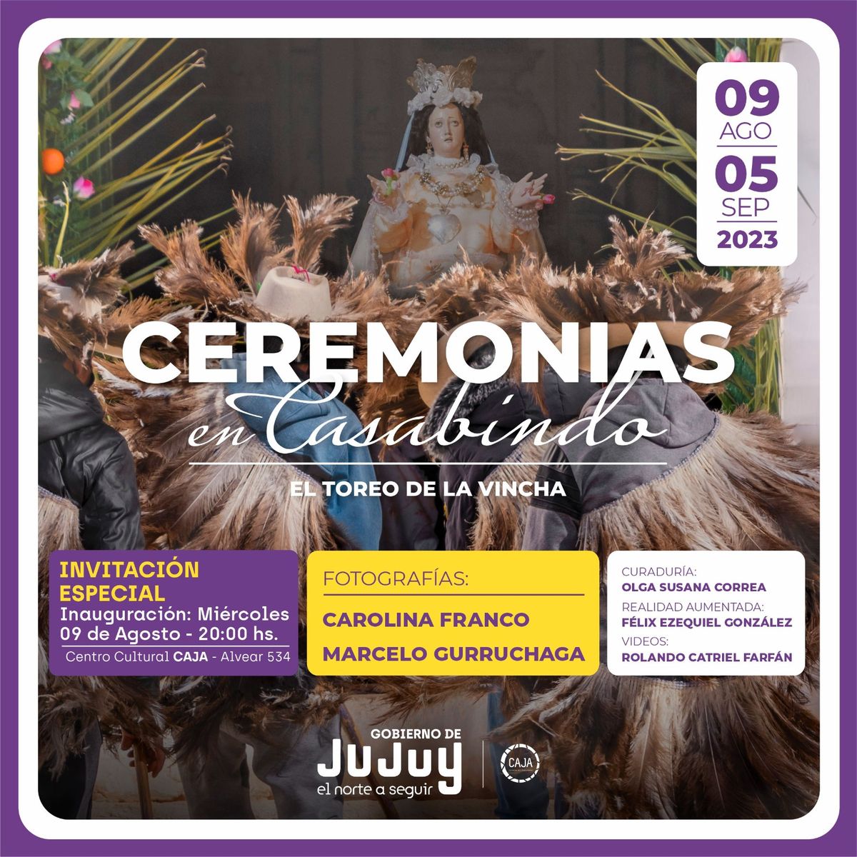 La Secretaria de Cultura invita al público en general a participar hoy a las 20 horas, en CAJA (Centro de Arte Joven Andino), a la inauguración de la muestra de los fotógrafos Carolina Inés Franco y Marcelo Gurruchaga denominada «Ceremonias en Casabindo – El Toreo de la Vincha». Podrá ser visitada hasta el 5 de setiembre de 2023.