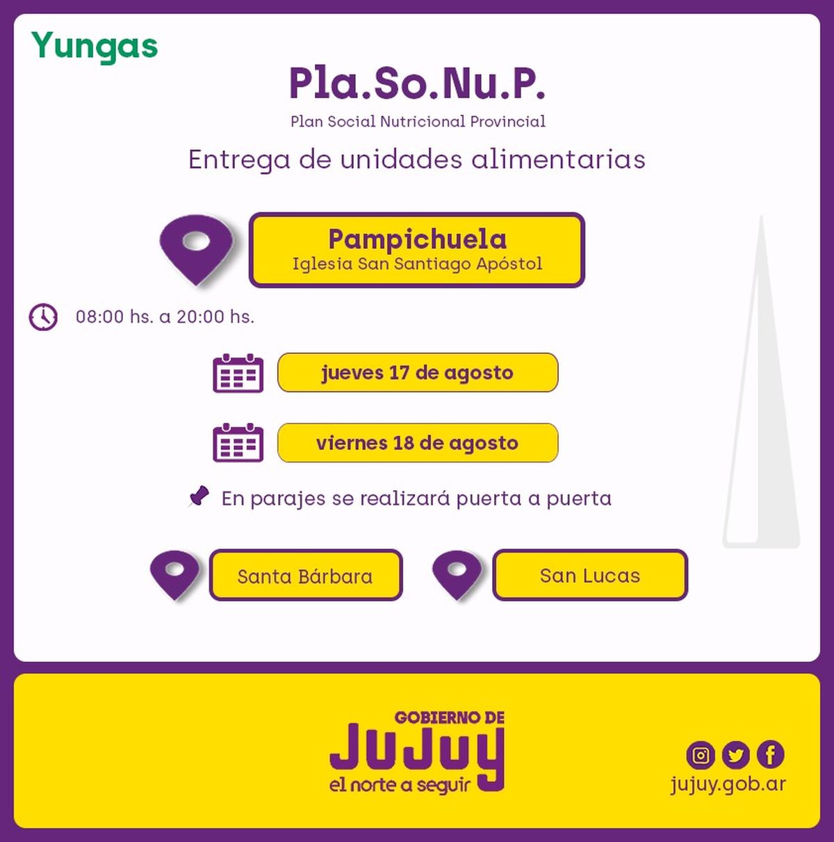 El Ministerio de Desarrollo Humano, a través de la Secretaría de Asistencia Directa y Calidad de Vida, comunica que desde el martes 15 de agosto, se efectuará la entrega directa de unidades alimentarias del Programa “Comer en Casa”, a familias de Palma Sola, Pampichuela y Palca de Aparzo.