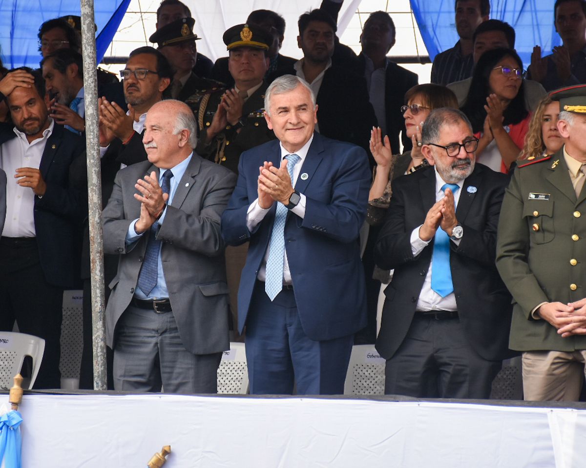 Fue justamente, el mandatario provincial quien dio la voz de mando para que la banda militar comience con la fanfarria que le dio marco al inicio del desfile cívico militar y escolar que se organizó en Av. Forestal de Alto Comedero.