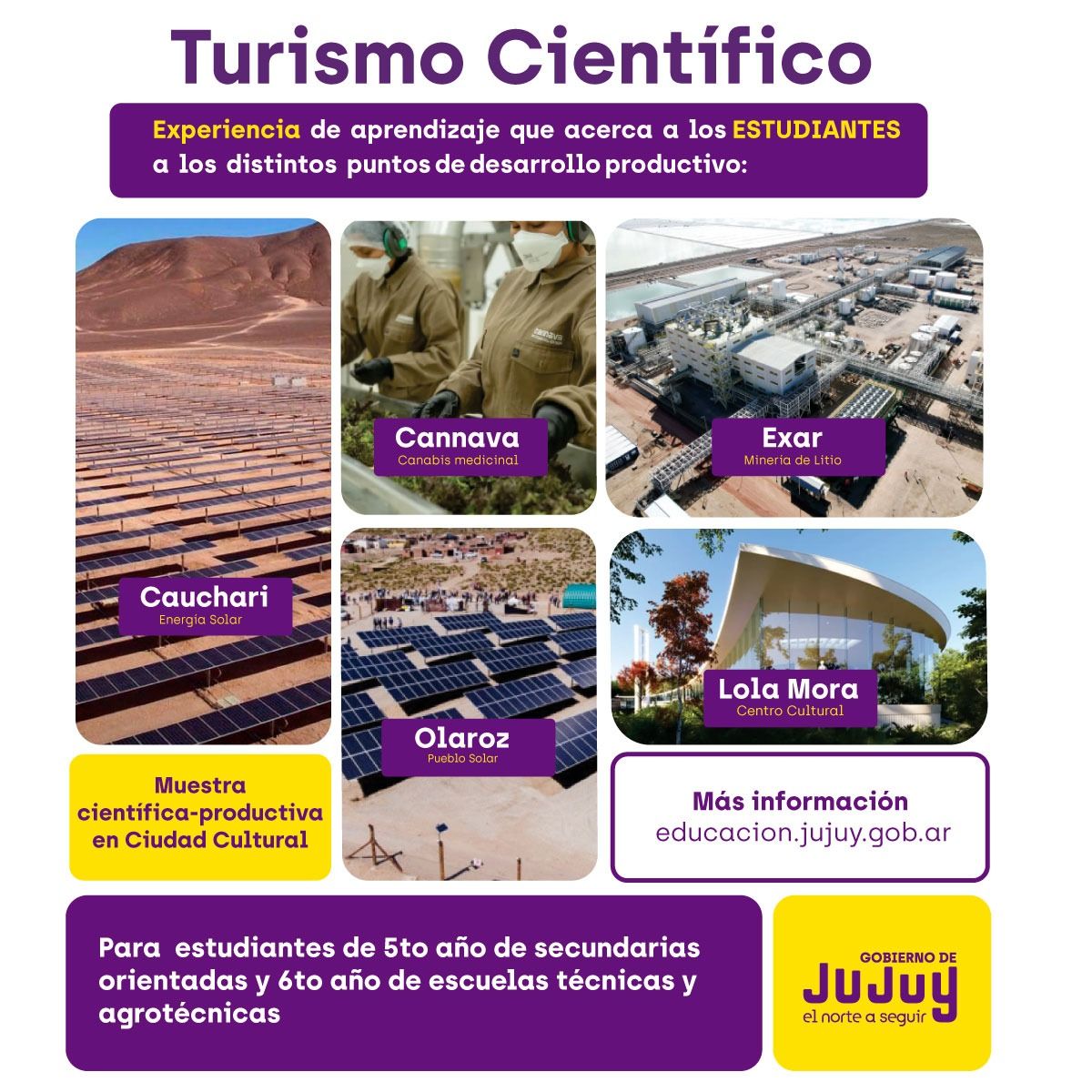 El Gobierno de la Provincia de Jujuy mediante los Ministerios de Educación, Desarrollo Económico y Producción, Infraestructura, la Secretaría de Energía y la Secretaría de Transporte, en el marco de las políticas socioeducativas que apuntan al sostenimiento de las trayectorias escolares y a la ampliación del universo cultural, efectúa el lanzamiento del programa «Turismo Científico», destinado a estudiantes que cursan el 5to año de Secundarias Orientadas y 6to año de Escuelas Técnicas y Agrotécnicas.