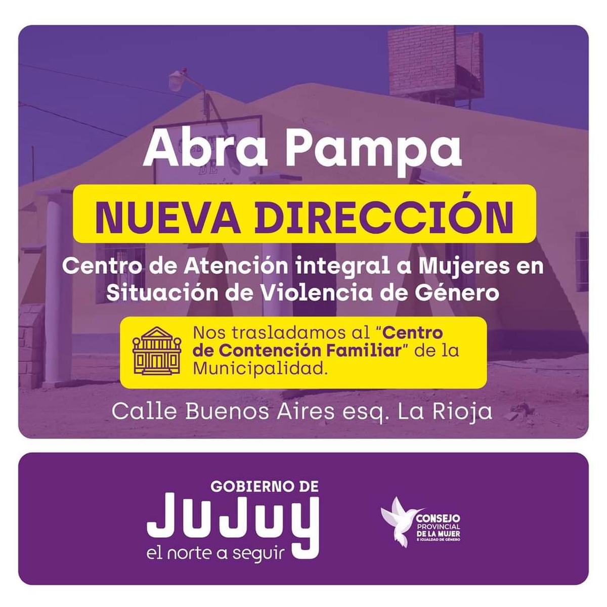 Desde el Consejo Provincial de la Mujer e Igualdad de Género se informa el traslado del Centro de Atención Integral a Mujeres en Situación de Violencia de Abra Pampa. A partir de hoy funcionará en el «Centro de Contención Familiar» dependiente de la Municipalidad de Abra Pampa, ubicado en calle Buenos Aires esquina La Rioja.