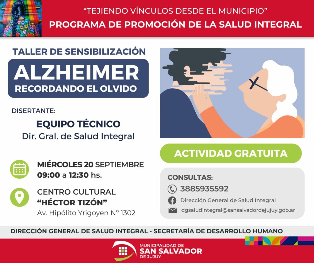 Como parte del Programa de Promoción de Salud Integral, la Dirección Gral. Salud Integral, dependiente de la Secretaría de Desarrollo Humano, invita a participar al del taller gratuito de sensibilización sobre la enfermedad del Alzheimer.