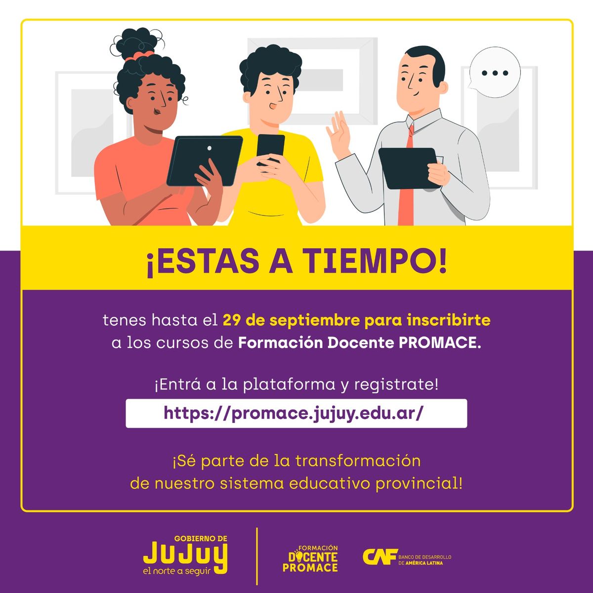 El Ministerio de Educación, a través de la Subsecretaría de Coordinación Educativa, informa a docentes en actividad de toda la provincia que todavía están a tiempo de inscribirse a los cursos gratuitos, y con puntaje docente, en la Plataforma de Formación del PROMACE (https://promace.jujuy.edu.ar/), hasta el 29 septiembre.