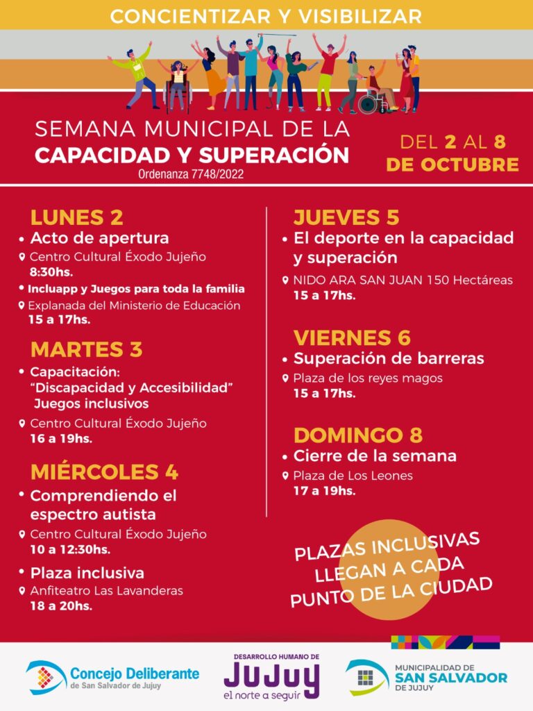 El lunes 2 de octubre a partir de las 9 horas, en el Centro Cultural “Éxodo Jujeño” tendrá lugar el acto de apertura de la “Semana de la Capacidad y la Superación” tras el cual se iniciarán las actividades descentralizadas e inclusivas en la Ciudad, que porpine la Municipalidad de San Salvador de Jujuy, en conformidad a la Ordenanza N° 7748 sancionada por el Concejo Deliberante.