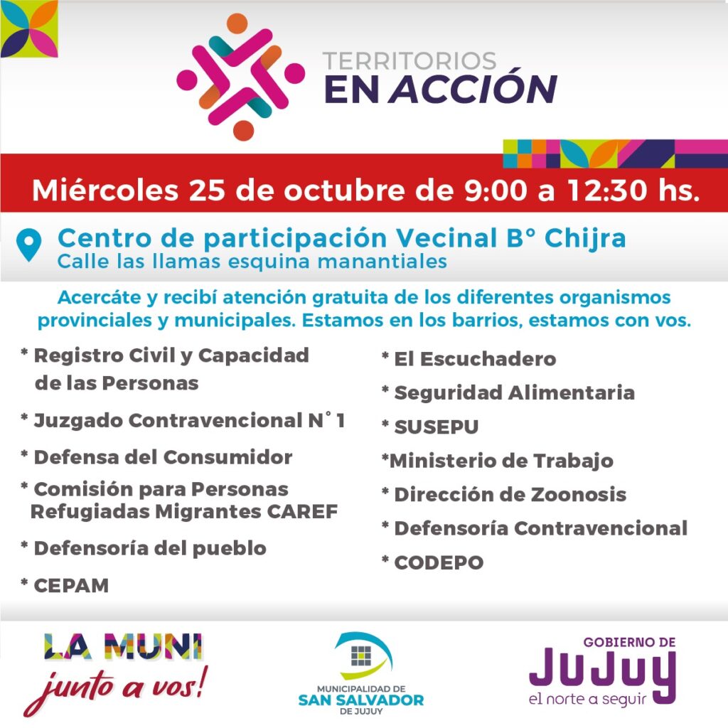 El Programa Municipal Territorios en Acción llegará al CPV del barrio Chijra ubicado en calle Llamas esq. Manantiales, el día miércoles 25 entre las 9 y las 12:30 hs., en un trabajo conjunto entre la Municipalidad de San Salvador de Jujuy y el Gobierno Provincial para recorrer diferentes sectores de la ciudad y acercar diferentes servicios y brindar asesoramiento de forma gratuita.