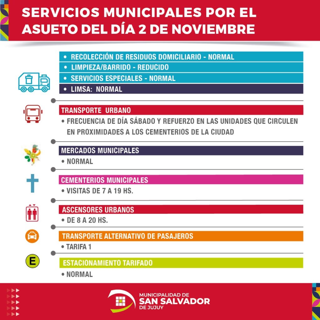 Atentos al asueto escolar y administrativo dispuesto para el jueves 2 de noviembre, por el “Dia de los Fieles Difuntos”, la Secretaría de Servicios Públicos del Ejecutivo Municipal, a través de la Dirección de Tránsito y Transporte, dio a conocer la prestación de servicios según el siguiente detalle: