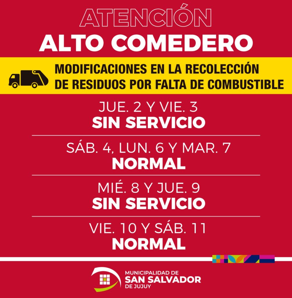 Por la escases de combustible de público conocimiento, la Secretaria de Gobierno a través de la Delegación de Alto Comedero dependiente del municipio capitalino, reprogramó el servicio de recolección de residuos en días y horarios establecidos, solicitando a la vez la actitud colaborativa de los vecinos del sector ante la problemática actual. Además informaron que el descacharrado previsto para el viernes 3 de noviembre queda suspendido.