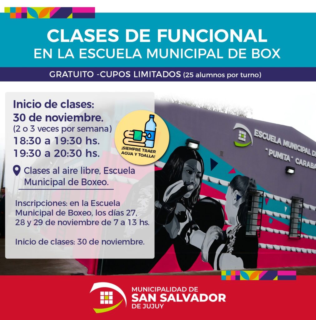 La Escuela Municipal de Box “Pumita Carabajal”, ubicada en avenida Párroco Marshke, anunció la apertura de clases de Funcional, una oportunidad para aquellos que buscan mantenerse en forma de una manera dinámica y desafiante. Con horarios flexibles, las inscripciones a las clases se podrán realizar a partir del 27 de noviembre.