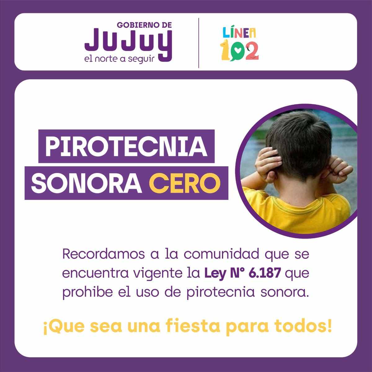 El Ministerio de Desarrollo Humano de la provincia de Jujuy desea recordar a toda la comunidad que se encuentra vigente la Ley N° 6.187 de Pirotecnia Sonora Cero, con el objetivo de permitir que todos puedan disfrutar de estas fiestas en armonía junto a su familia.