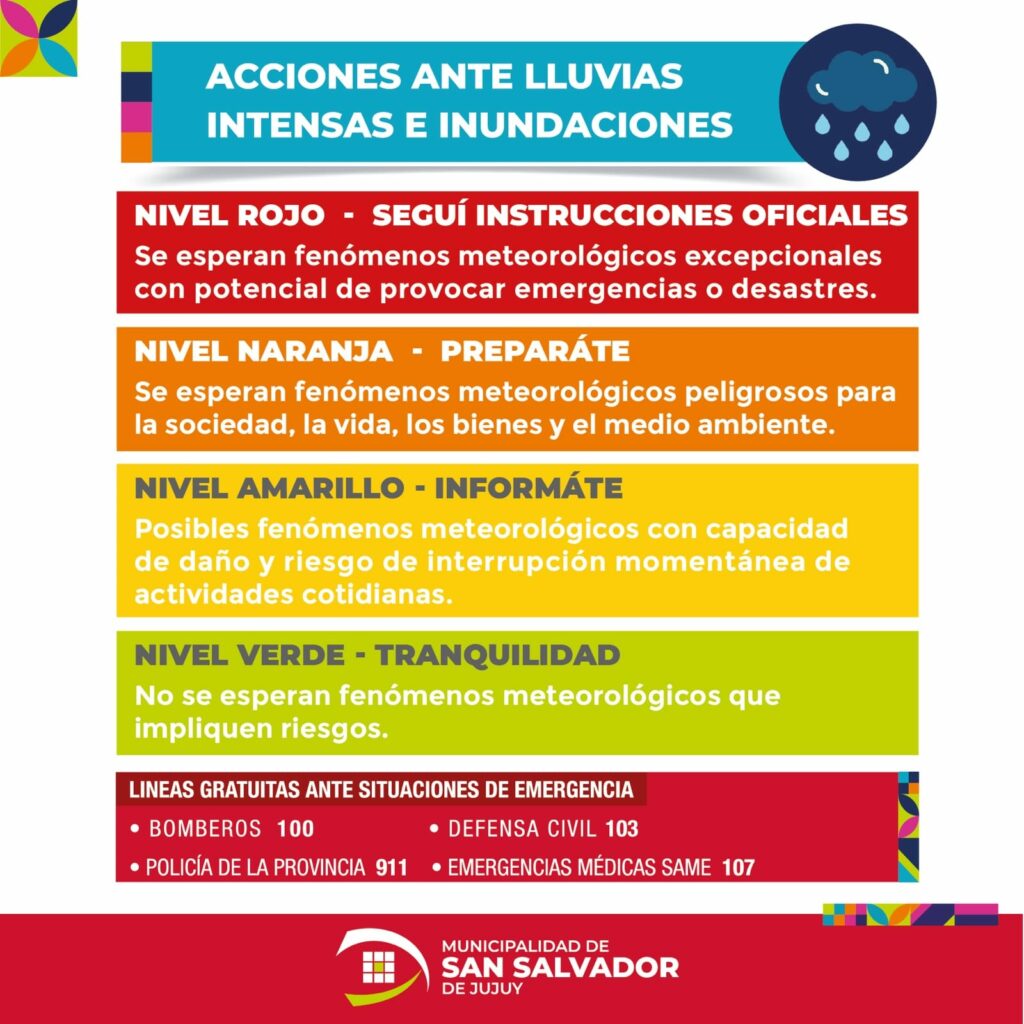 Desde la Municipalidad de San Salvador de Jujuy convocan a todos los vecinos de la ciudad a estar atentos a los mensajes transmitidos por los diferentes medios de comunicación acerca de la gravedad que pudieran provocarse a raíz de la gran cantidad de agua caída en una época signada por tormentas frecuentes o días de alerta naranja.