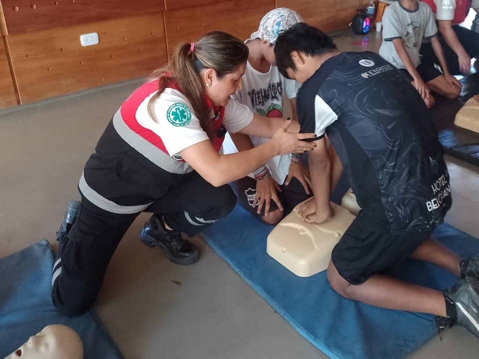 Posteriormente, los profesionales de la salud procedieron a enseñar a los niños cómo actuar en caso de accidentes o desvanecimientos. Utilizando muñecos y al ritmo de una canción popular, mostraron de manera práctica la posición de manos y brazos necesaria para realizar la reanimación cardiopulmonar (RCP).