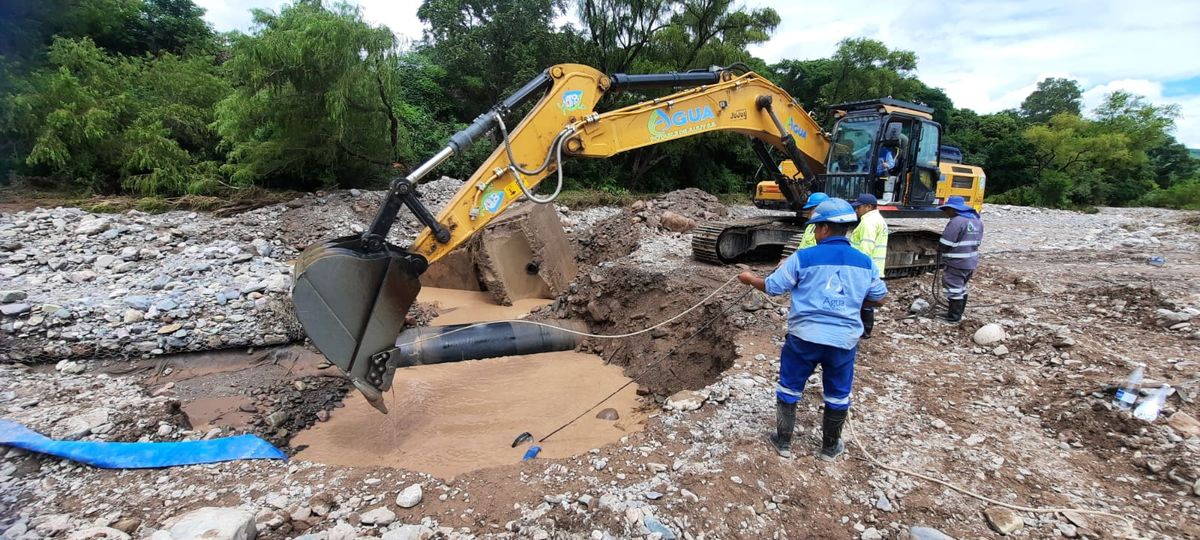 Personal operativo junto a maquinarias pesadas y equipos especiales trabajaron arduamente en medio de la lluvia en los encauses de tomas y simultáneamente en la limpieza de plantas presedimentadoras como también en desarenadores y filtros con el fin de mantener normalizado el servicio esencial.