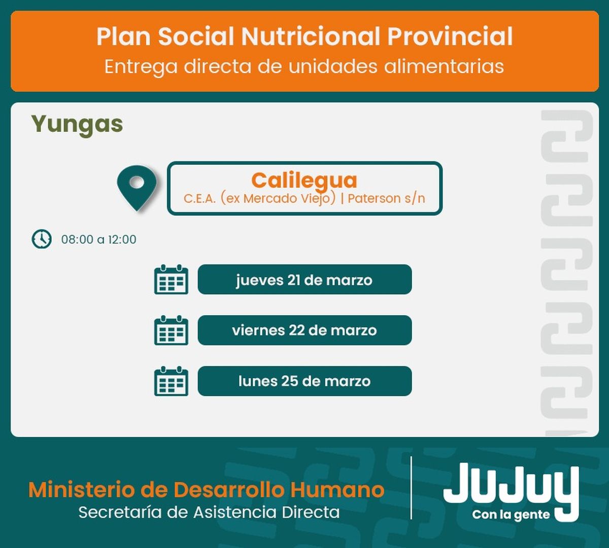 El Ministerio de Desarrollo Humano, a través de la Secretaría de Asistencia Directa, informa que desde el jueves 21 de marzo, se llevará a cabo la entrega de unidades alimentarias del Programa “Comer en Casa” a familias de Caimancito, Calilegua y Palma Sola.