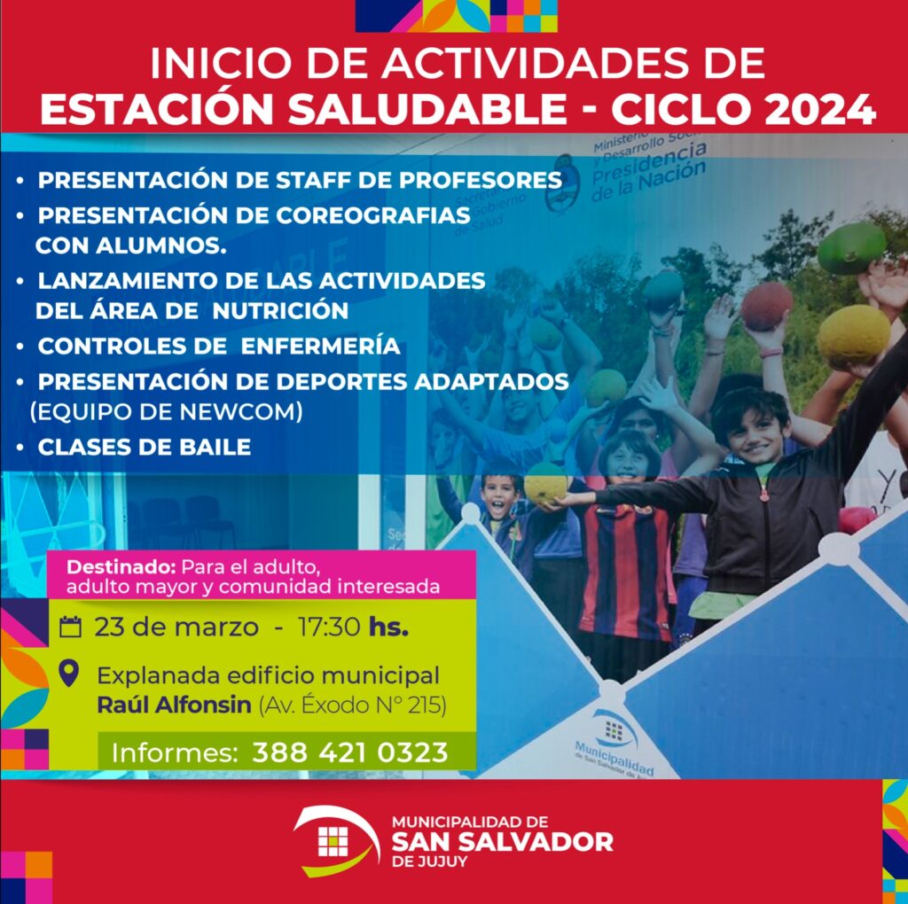 La Secretaría de Desarrollo Humano de la Municipalidad de San Salvador de Jujuy invitó a toda la comunidad a participar de la apertura de las actividades de la Estación Saludable. El evento se llevará a cabo el viernes 23 de marzo, a partir de las 17.30 horas, en la esplanada del edificio municipal Raúl Alfonsín, ubicado en la avenida El Éxodo N°215.