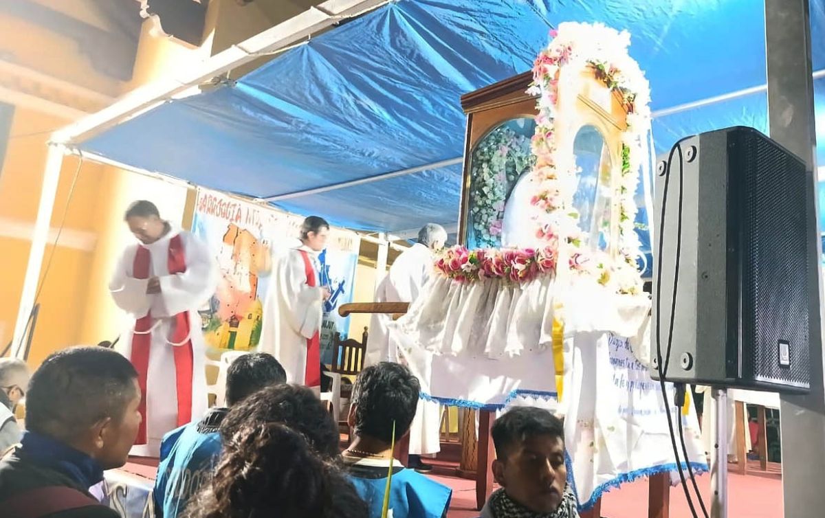 Una multitud de fieles, peregrinos y bandas de sikuris se concentraron y acompañó el recibimiento de la Virgen de Copacabana de Punta Corral, en la Parroquia nuestra señora de los Dolores de Tumbaya.