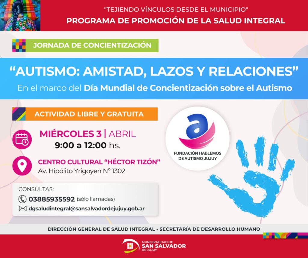 En el marco del Día Mundial de Concientización sobre el Autismo, la Dirección General de Salud Integral conjuntamente con la Fundación Hablemos de Autismo Jujuy, invitan a todos los interesados a participar de una Jornada de Concientización sobre el Autismo, el día miércoles 3 de abril de 9 a 12 hs. en el Centro Cultural Héctor Tizón ubicado en av. Hipólito Yrigoyen 1302.