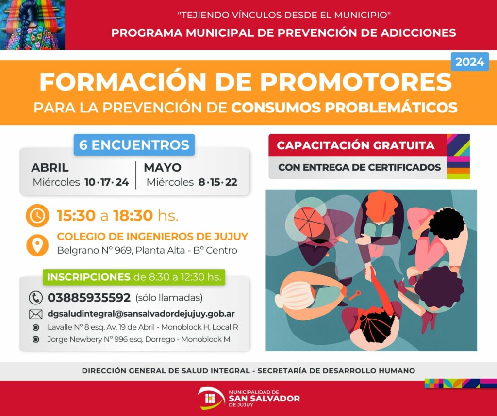 Continuando con el Programa Municipal de Prevención de Adicciones, la Dirección General de Salud Integral anunció la realización de la próxima capacitación gratuita y abierta al público profesional y en general denominada: “Formación de Promotores para la Prevención de Consumos Problemáticos”, la misma se llevará a cabo a partir del miércoles 10 de abril con una duración de 6 encuentros semanales hasta el 22 de mayo en el salón del Colegio de Ingenieros, situado en calle Belgrano Nº 769.