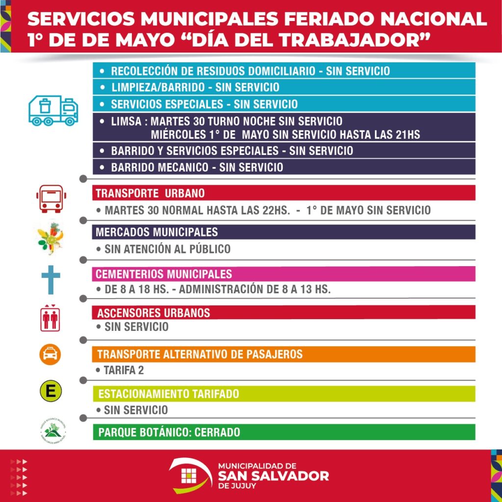 Atentos a las celebraciones del próximo lunes 1º de mayo, fecha en la que se conmemora el Día del Trabajador, la Municipalidad de San Salvador de Jujuy informó a la comunidad la modalidad de prestación de servicios por el feriado.