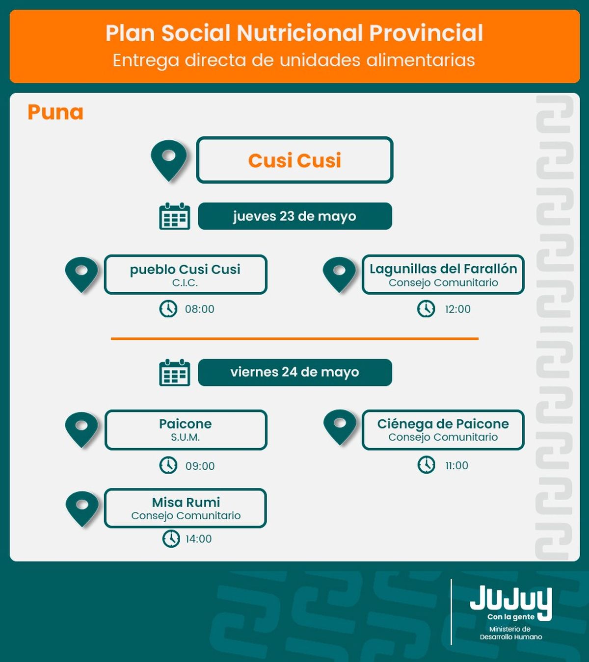 El Ministerio de Desarrollo Humano, mediante de la Secretaría de Asistencia Directa, comunica que, desde el miércoles 22 de mayo, se realizará la entrega de módulos alimentarios del programa “Comer en Casa”, a familias de Santa Catalina y Cusi Cusi, localidades que pertenecen al Departamento de Santa Catalina.