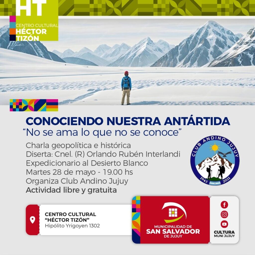 El Club Andino Jujuy, con la colaboración de la Municipalidad de San Salvador de Jujuy, organiza una charla imperdible titulada “Conociendo Nuestra Antártida – No se ama lo que no se conoce”. Este evento busca acercar al público a la fascinante realidad del continente antártico y tendrá lugar en el Centro Cultural Tizón el martes, 28 de mayo, a las 19 horas de manera libre y gratuita.