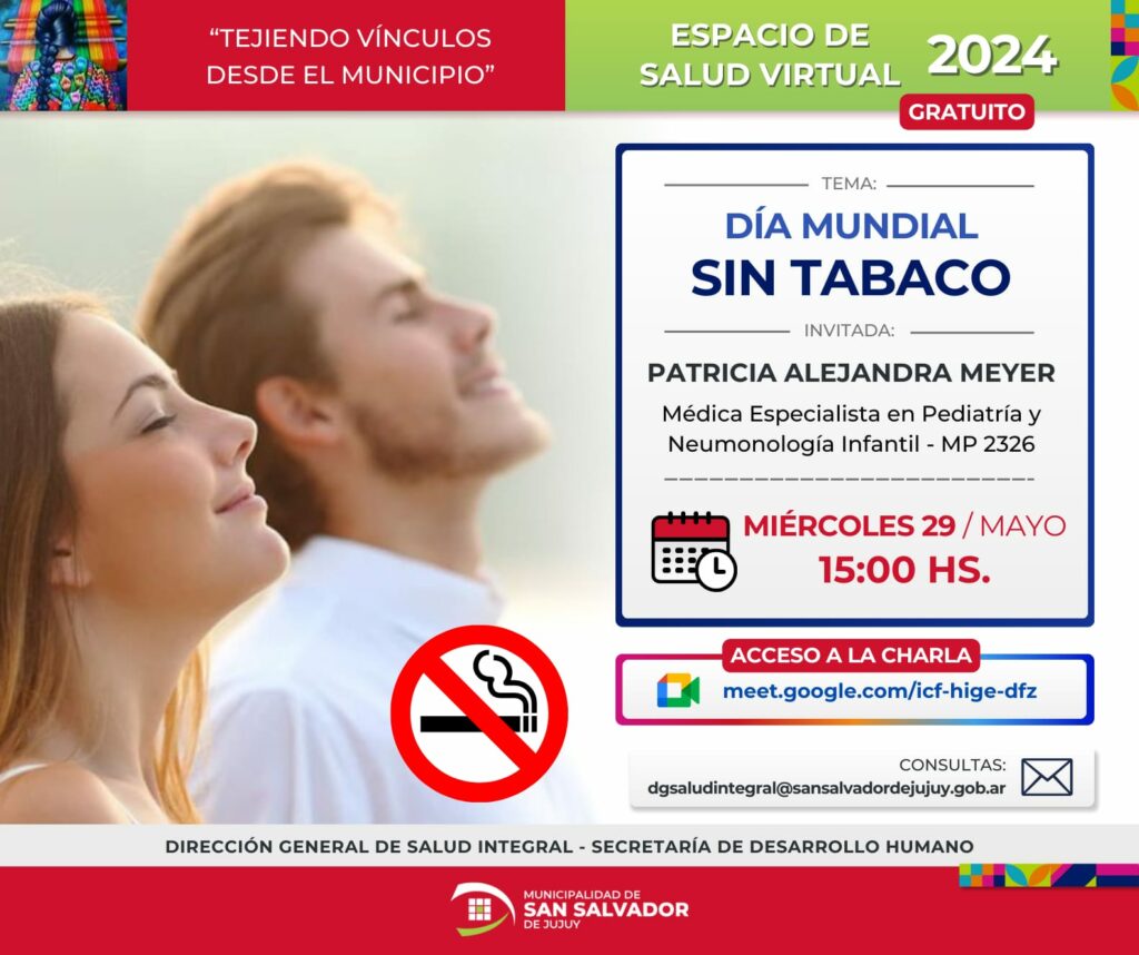 En el marco del programa “Tejiendo Vínculos desde el Municipio”, la Municipalidad de San Salvador de Jujuy a través de la Dirección General de Salud Integral de la Secretaría de Desarrollo Humano invitó a la comunidad a participar de un nuevo taller gratuito: Espacio de Salud Virtual, en conmemoración del “Día Mundial Sin Tabaco”.