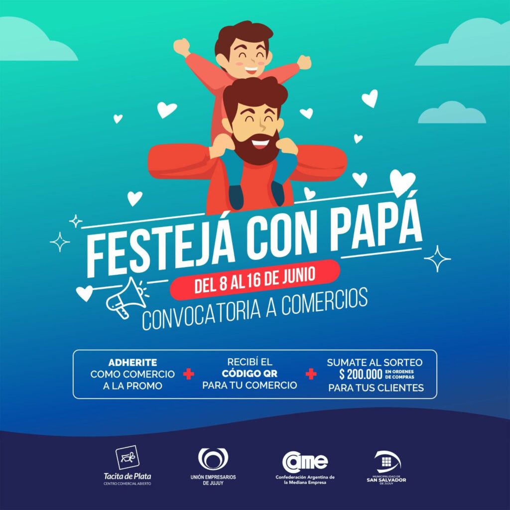 La Municipalidad de San Salvador de Jujuy, en colaboración con la Unión Empresarios de Jujuy y la Confederación Argentina de la Mediana Empresa (CAME), invita a todos los comercios locales a sumarse a la promoción “Festejá con Papá”. La iniciativa busca impulsar las ventas y ofrecer a los clientes la oportunidad de ganar valiosas órdenes de compra, por esta razón los comercios que deseen participar deben definir sus propias promociones y descuentos, que estarán vigentes del 8 al 16 de junio.