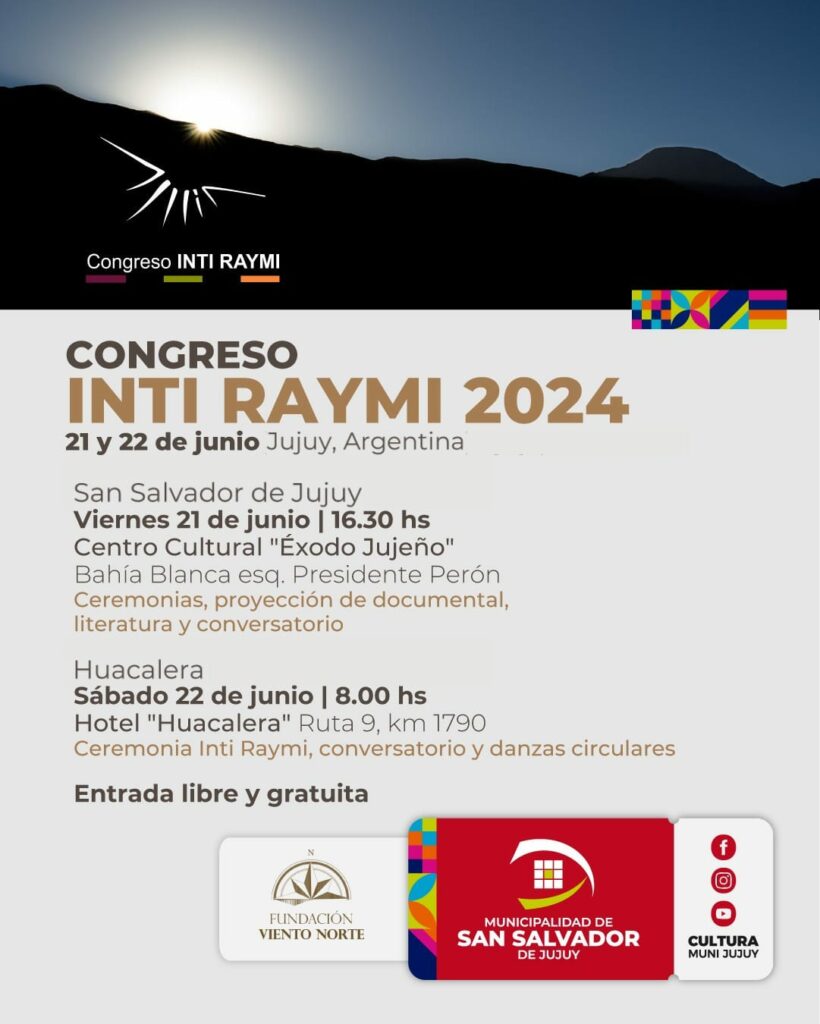 Con apoyo de la Secretaría de Cultura y Turismo de la Municipalidad de San Salvador de Jujuy, el viernes 21 y el sábado 22, la capital jujeña y la colorida localidad de Huacalera -, serán escenarios del Congreso “Inti Raymi 2024, que organizará la Fundación Viento Norte.