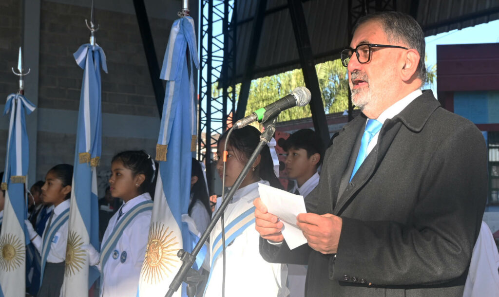 Jorge, tras el ingreso de las banderas de ceremonia de los 14 establecimientos y la entonación del Himno Nacional a cargo de la banda municipal “19 de Abril”, procedió a la lectura de la guía de la toma de promesa de lealtad a la Bandera Argentina. En su discurso, subrayó que la bandera “fue creada en los albores de la libertad” y pidió el compromiso de “respeto, tolerancia y estudio”.