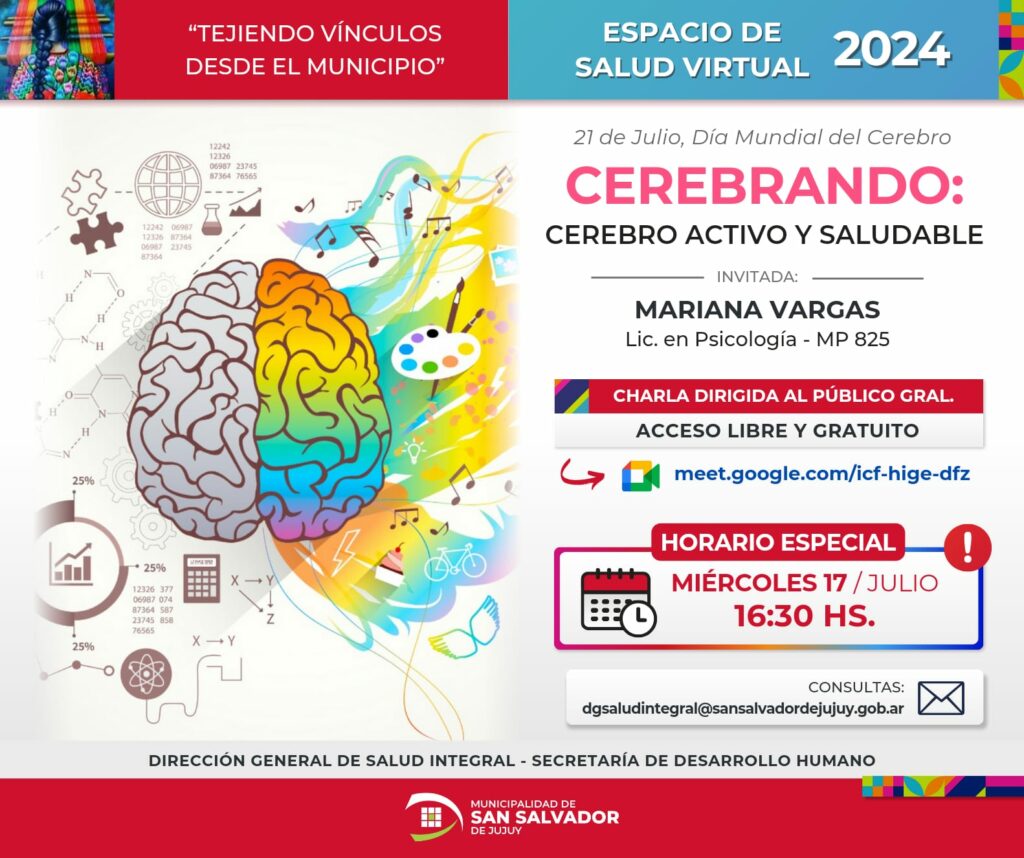 En el marco del Día Mundial del Cerebro, que se conmemora el 21 de julio, la Dirección General de Salud Integral de la Secretaría de Desarrollo Humano de la Municipalidad de San Salvador de Jujuy propone una nueva edición del Espacio de Salud Virtual. La actividad se realizará el próximo miércoles 17 de julio a las 16:30 horas y contará con la participación de Mariana Vargas, licenciada en Psicología.