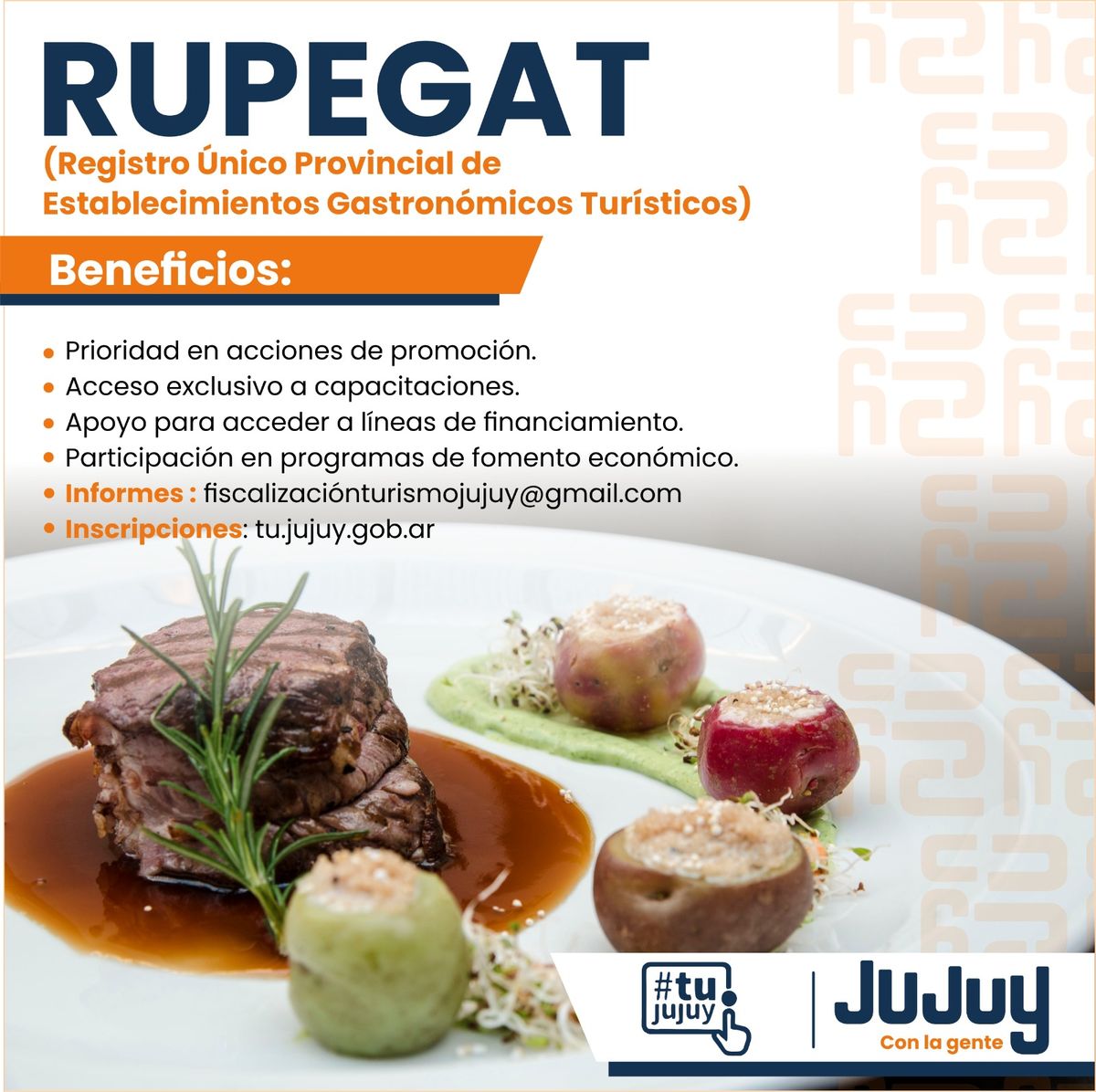 Gracias al trabajo realizado conjuntamente entre el Ministerio de Cultura y Turismo, junto al de Planificación Estratégica y Modernización de la provincia de Jujuy, los establecimientos interesados en la inscripción al RUPEGAT podrán hacerlo mediante la web tu.jujuy.gob.ar y para mayor información contactarse a través del correo electrónico [email protected].