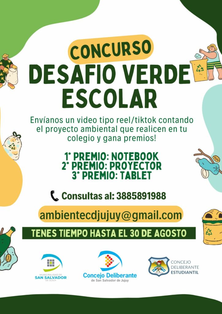 Recuerdan a las instituciones educativas que aún está vigente el concurso “Desafío Verde Escolar”. Este certamen está destinado a escuelas públicas y privadas de nivel secundario, con el objetivo de fomentar y visibilizar las prácticas ambientales sostenibles que se llevan a cabo en los colegios de la ciudad está organizado por el Concejo Deliberante de San Salvador de Jujuy, en colaboración con la Coordinación de Juventud y Adolescencia del municipio