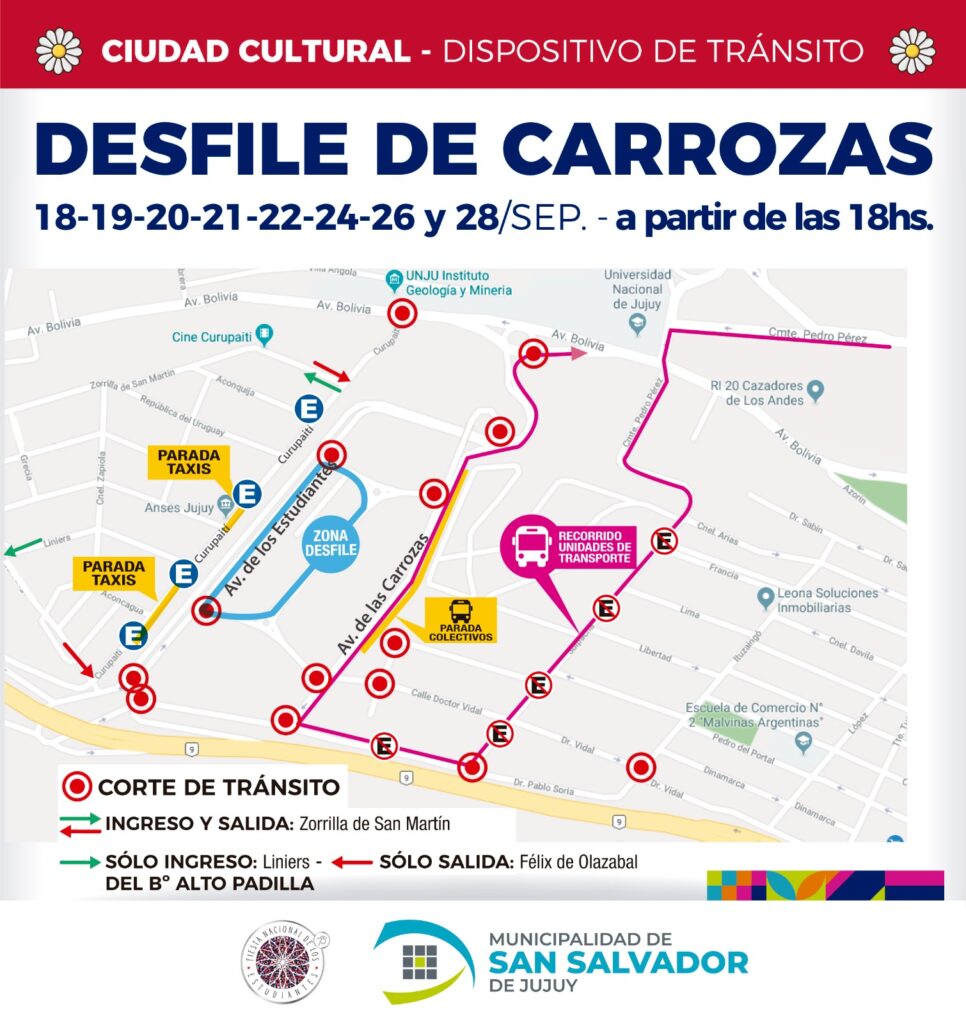 La Dirección de Tránsito y Transporte, dependiente de la Secretaría de Servicios Públicos de la Municipalidad de San Salvador de Jujuy, informa a la comunidad y a los conductores sobre las medidas especiales de tránsito que se implementarán con motivo de los Desfiles de Carrozas, que se celebrarán en Ciudad Cultural. los días 18, 19, 20, 21, 22, 24, 26 y 28 de septiembre.