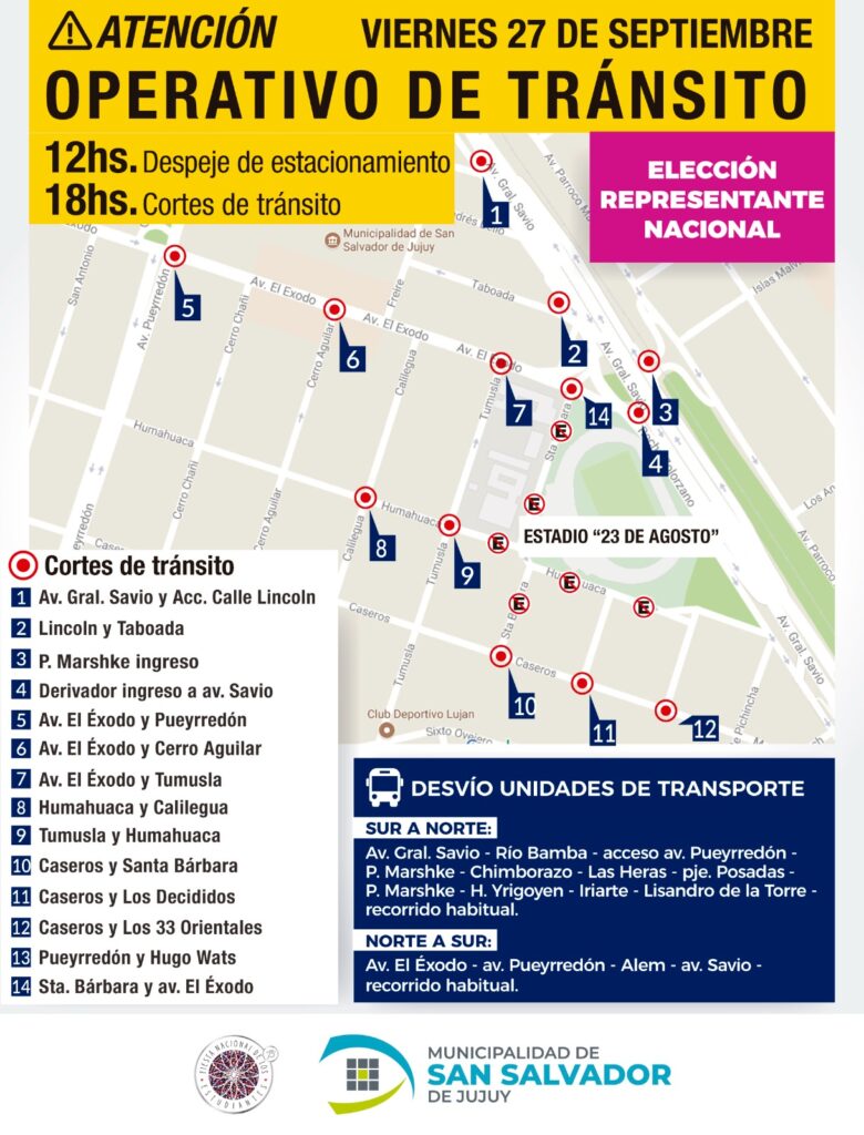 La Dirección de Tránsito y Transporte, dependiente de la Secretaría de Servicios Públicos de la Municipalidad de San Salvador de Jujuy, informa a la comunidad y a los conductores que, debido a la realización de la Elección Representante Nacional de los Estudiantes en el estadio “23 de Agosto” este viernes 27 de septiembre a las 21:00 horas, se implementarán modificaciones en los recorridos del transporte urbano de pasajeros y cortes de tránsito en las inmediaciones.