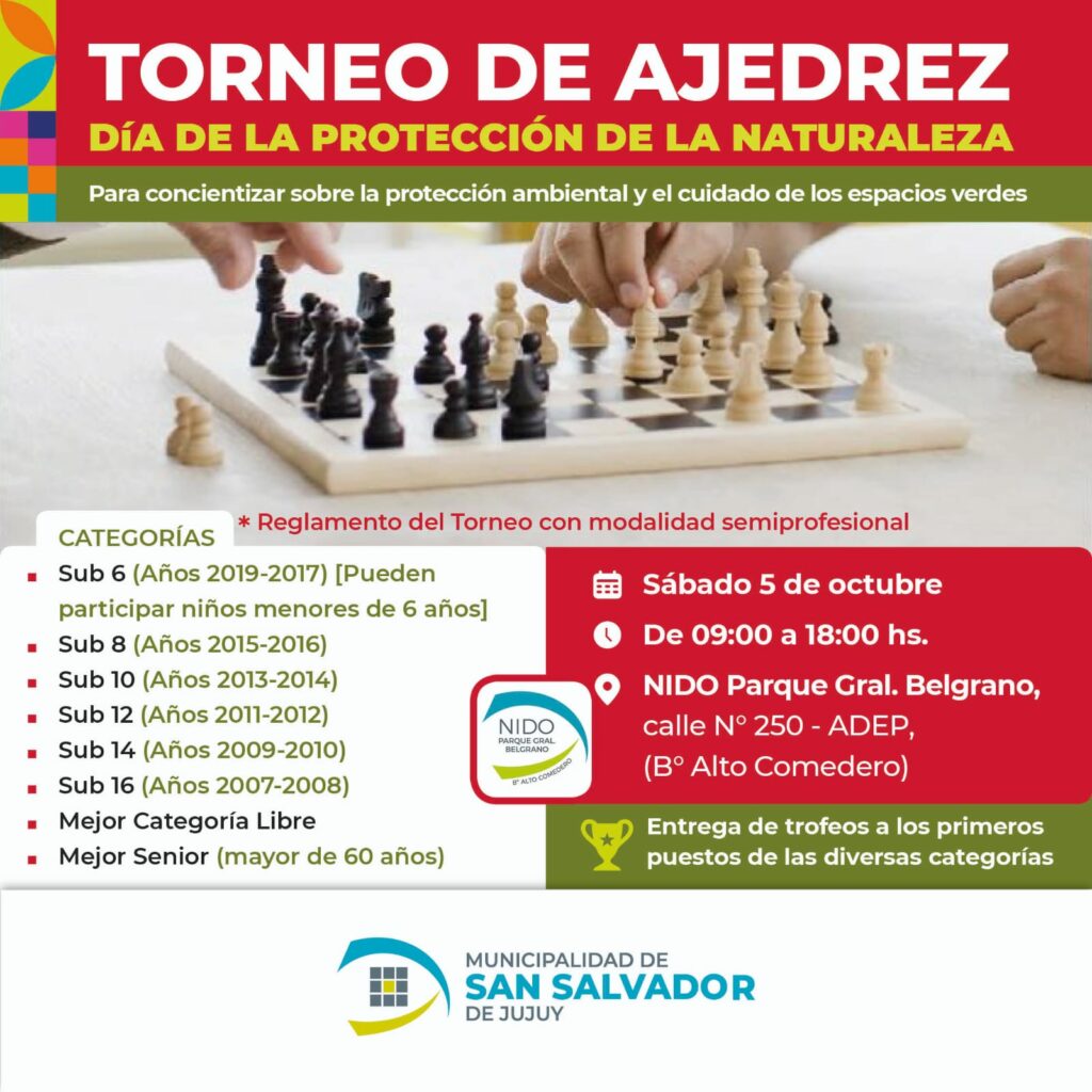La Municipalidad de San Salvador de Jujuy invita a la comunidad a participar del Torneo de Ajedrez 2024, “Día de la protección de la Naturaleza”, previsto para el sábado 5 de octubre, desde las 9 horas, en dependencias del NIDO Parque Gral. Belgrano, ubicado en calle 250 del barrio ADEP de Alto Comedero. Los interesados en participar del evento, que tendrá carácter semiprofesional, podrán registrar su inscripción hasta el jueves 3 de octubre.