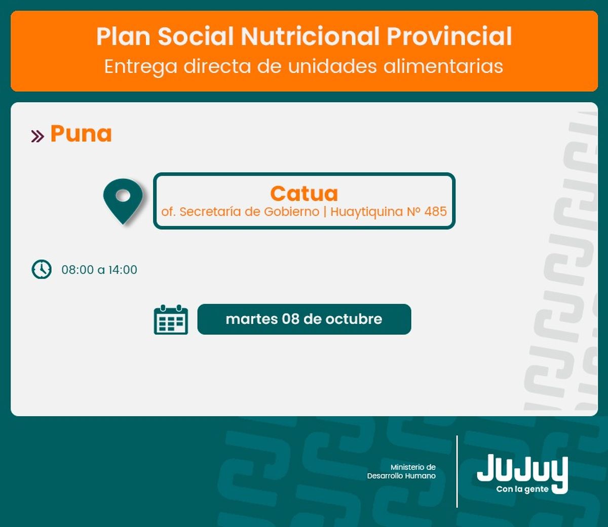 El Ministerio de Desarrollo Humano, mediante la Secretaría de Asistencia Directa, comunica que desde el lunes 07 de octubre, se concretará la entrega directa de módulos alimentarios del Programa “Comer en Casa”, a familias de Purmamarca, Jama y Catua.