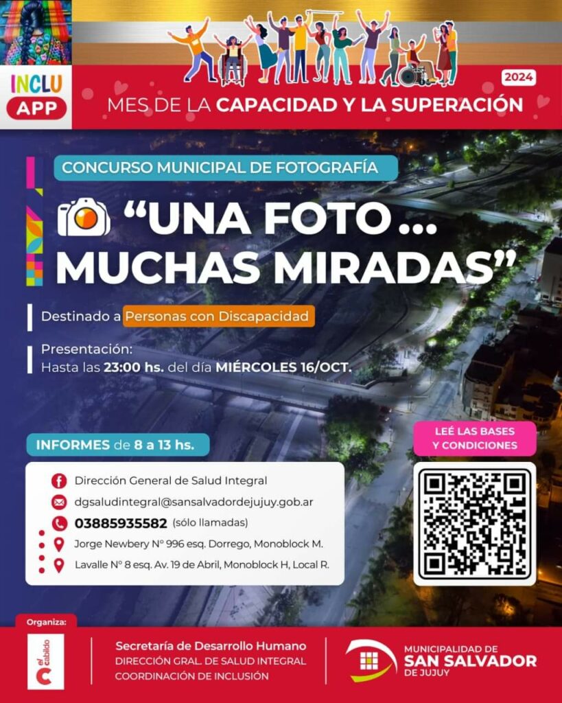 En el marco del Mes de la Capacidad y la Superación, la Municipalidad de San Salvador de Jujuy, a través de la Secretaría de Desarrollo Humano invita a personas con discapacidad, a participar en el concurso “Una Foto, Muchas Miradas”. Este certamen busca captar, a través de imágenes, cómo se vive la inclusión en la vida cotidiana y social de la ciudad.