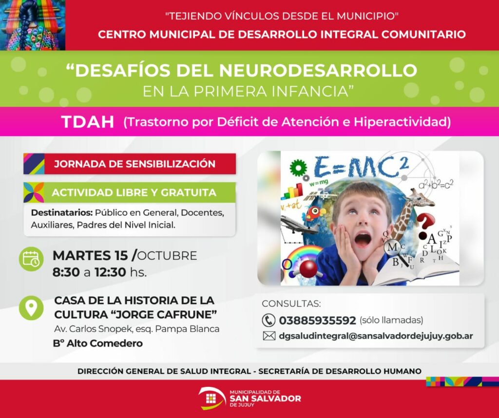 La Dirección General de Salud Integral, a través del Programa Municipal “Criar-Aprender-Cuidar” perteneciente al Ce.M.D.I.C (Centro Municipal de Desarrollo Integral Comunitario), invita a la jornada de sensibilización sobre los trastornos por déficit de atención e hiperactividad (TDAH) destinada a docentes, auxiliares, padres con hijos en el nivel inicial y al público en general.