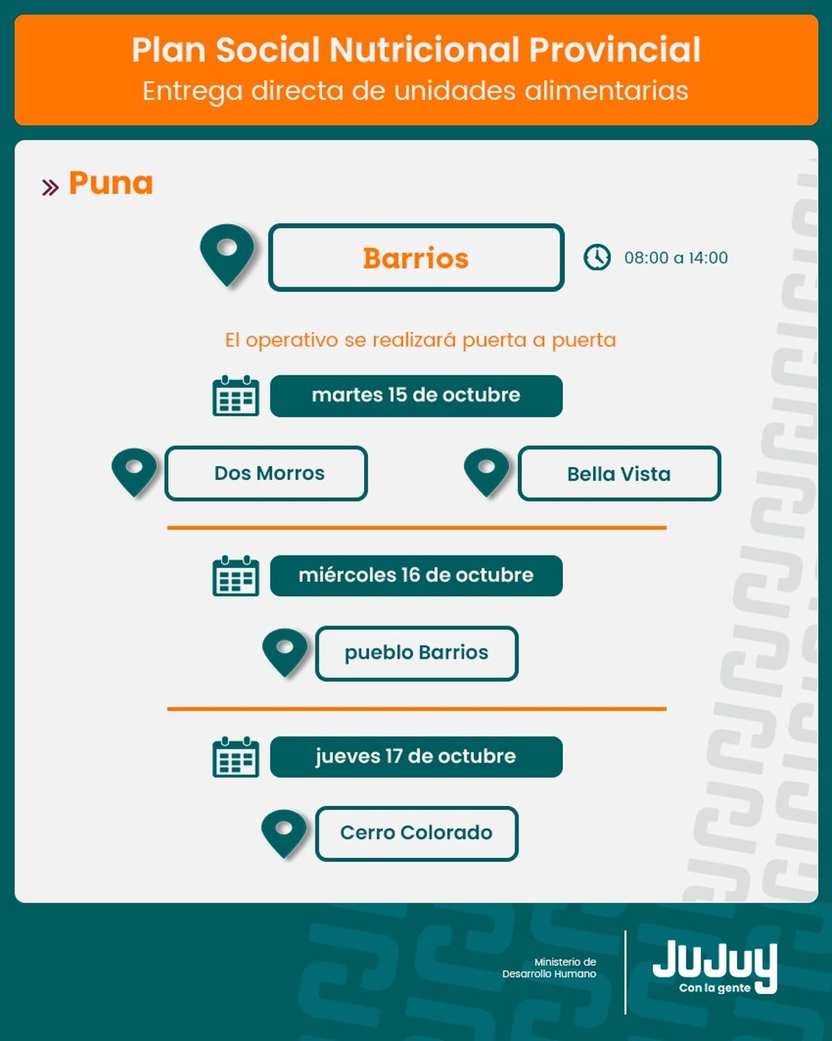 El Ministerio de Desarrollo Humano de Jujuy, por medio de la Secretaría de Asistencia Directa, comunica que a partir del martes 15 de octubre se efectuará la entrega directa de unidades alimentarias del programa “Comer en Casa” destinadas a familias de Barrios y Yavi.