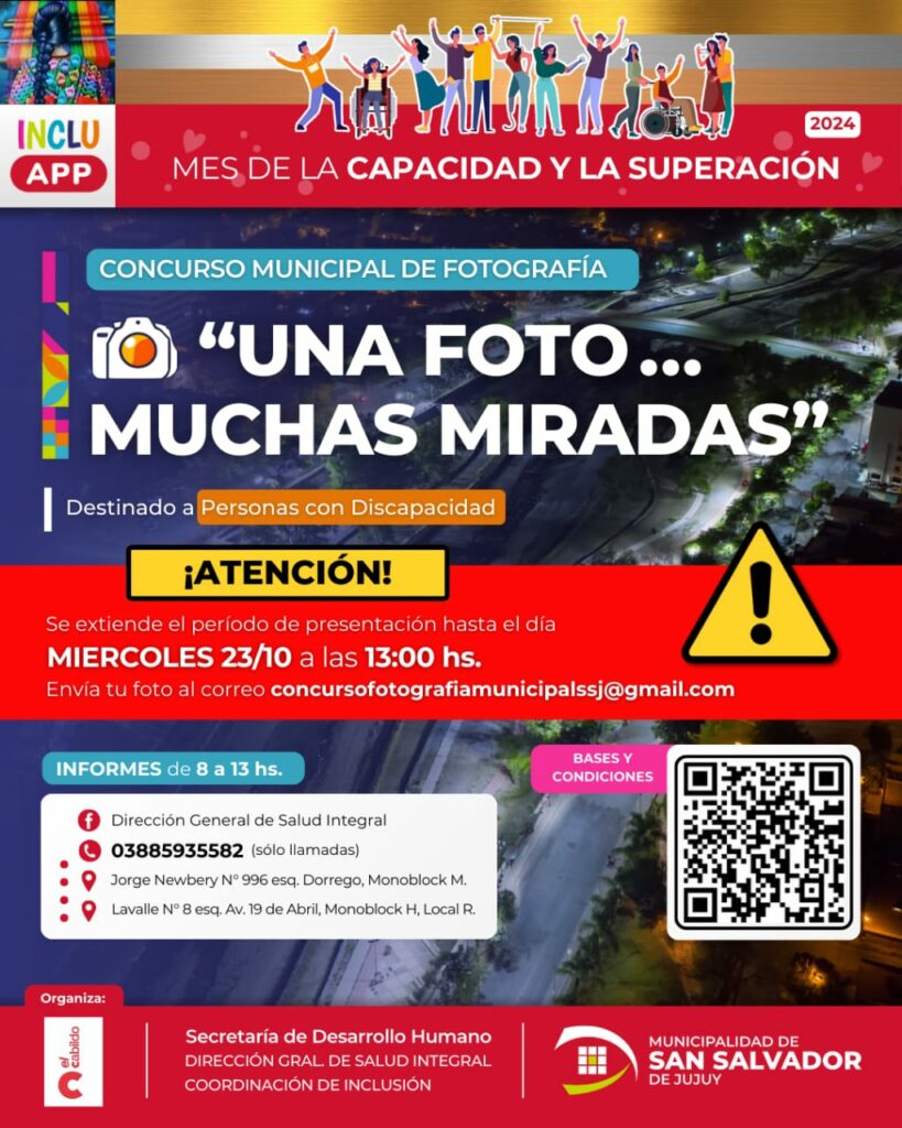 “Una Foto, Muchas Miradas”, ofrece a los participantes una plataforma para mostrar su visión y resaltar a San Salvador de Jujuy como una auténtica Capital de la Inclusión. Cada fotografía contará una historia, utilizando la cámara como herramienta para destacar la diversidad y la integración en los diferentes ámbitos de la vida jujeña.