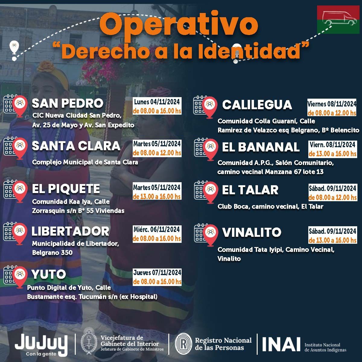 El Gobierno de la Provincia, de manera conjunta con diferentes organismos nacionales, iniciará el operativo “derecho a la identidad” a integrantes de Comunidades indígenas guaraníes de la provincia, localizadas en San Pedro, Santa Clara, el Piquete, Libertador, Yuto, Calilegua, El Bananal, El Talar y Vinalito, entre el 04 y el 09 de noviembre.