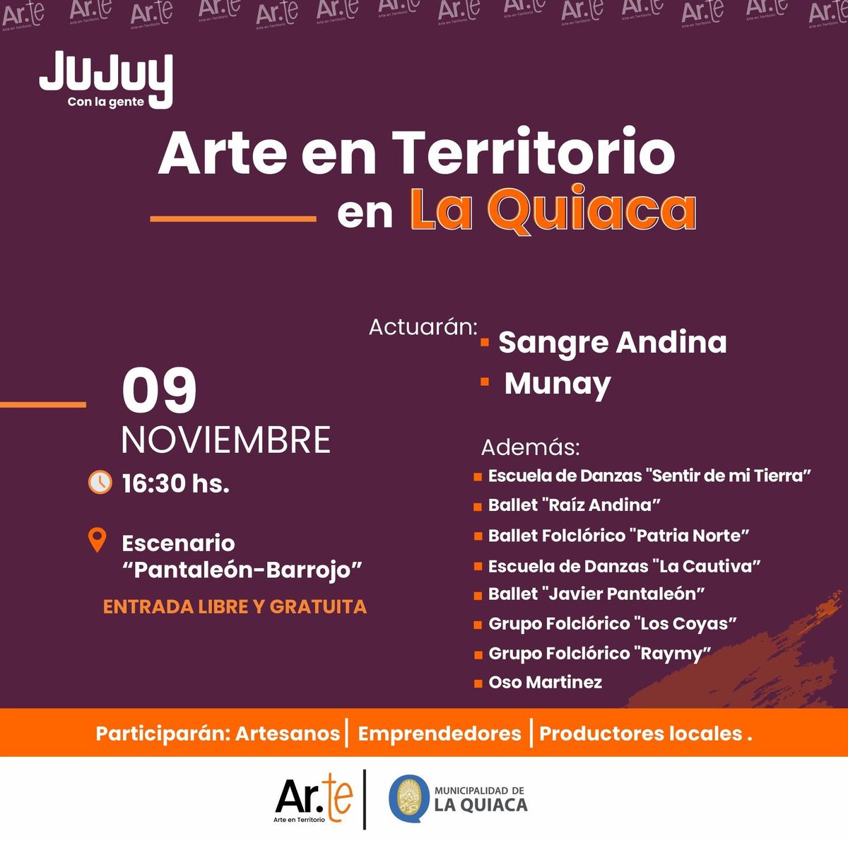 El programa Ar.te que impulsa la Secretaría de Cultura llega el próximo sábado 9 a las 16, 30 horas, en el Escenario «Pantaleón – Barrojo» de la ciudad de La Quiaca, con una nutrida grilla de cantantes de la Provincia y generando un espacio cultural para los artistas del lugar. Además se contará con una feria de artesanos, emprendedores y productores locales.