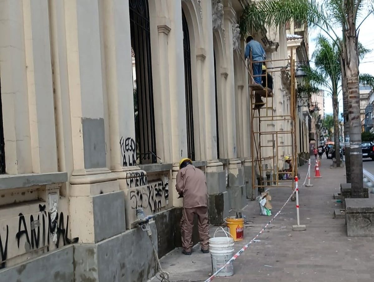 Los trabajos se realizan en la fachada, sobre calle Belgrano, con el fin de poner en condiciones óptimas el edificio, caro al sentimiento de los jujeños, y considerado Monumento Histórico Nacional.