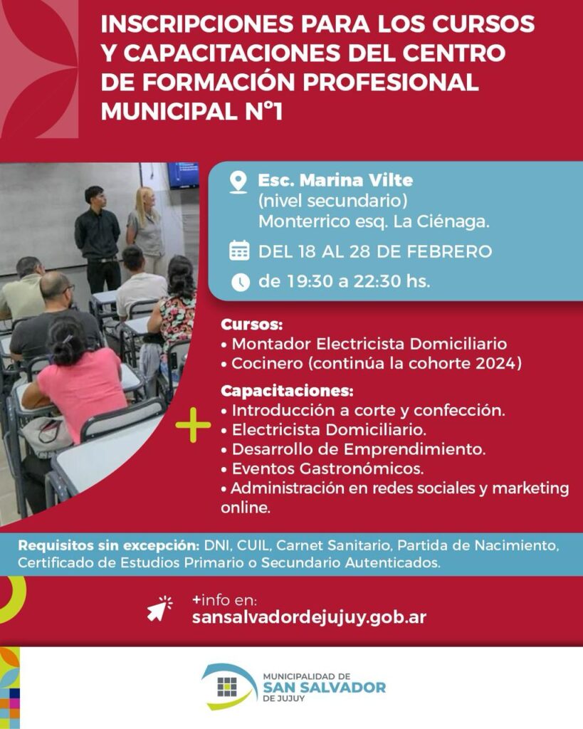 Con una importante oferta de capacitación y oficios que se dictarán en el ciclo lectivo 2025, la Dirección de Educación del Municipio Capitalino y el Centro de Formación Profesional Nro.1, convocan a los interesados a inscribirse desde el 18 al 28 de febrero en las instalaciones de la Escuela Nro. 1 “Marina Vilte” de Alto Comedero (Nivel Secundario), en el horario de 19.30 a 22.30. El inicio de clases será el 5 de marzo.