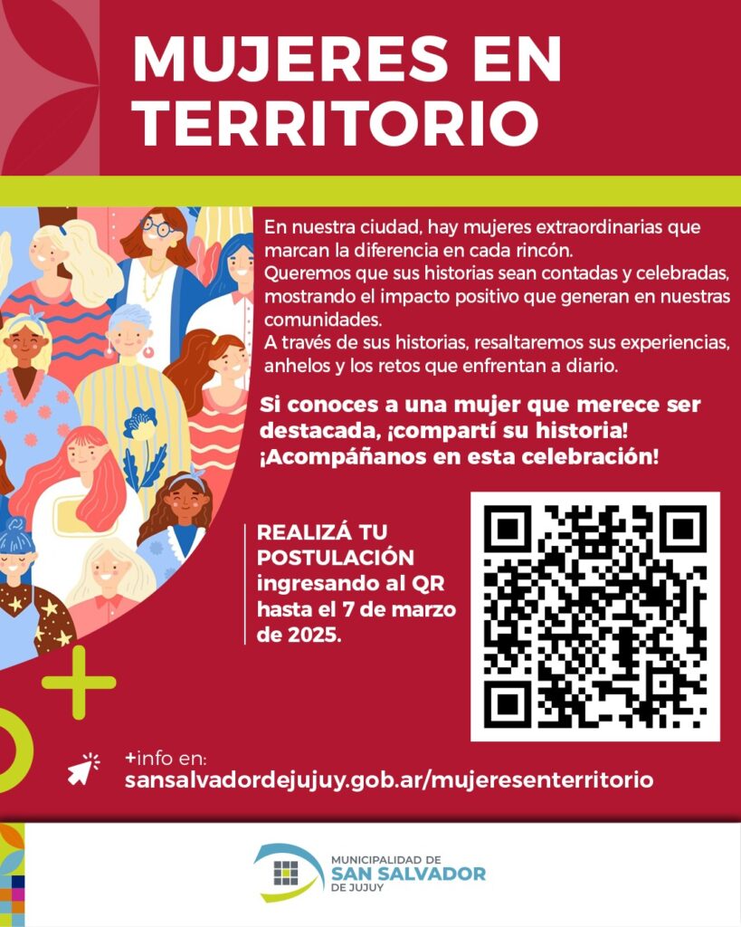 Con el fin de visibilizar su esfuerzo y éxito, a través del programa Mujeres en Territorio, el Municipio invita a reconocer a aquellas mujeres que, día a día, transforman nuestro entorno. Ya sea en el campo empresarial, artístico o social, instituciones barriales podrán postular estas mujeres por el impacto positivo que generan en sus comunidades, a partir del 20 de febrero hasta el 7 de marzo a través de la página web: www.sansalvadordejujuy.gob.ar/mujeresenterritorio/