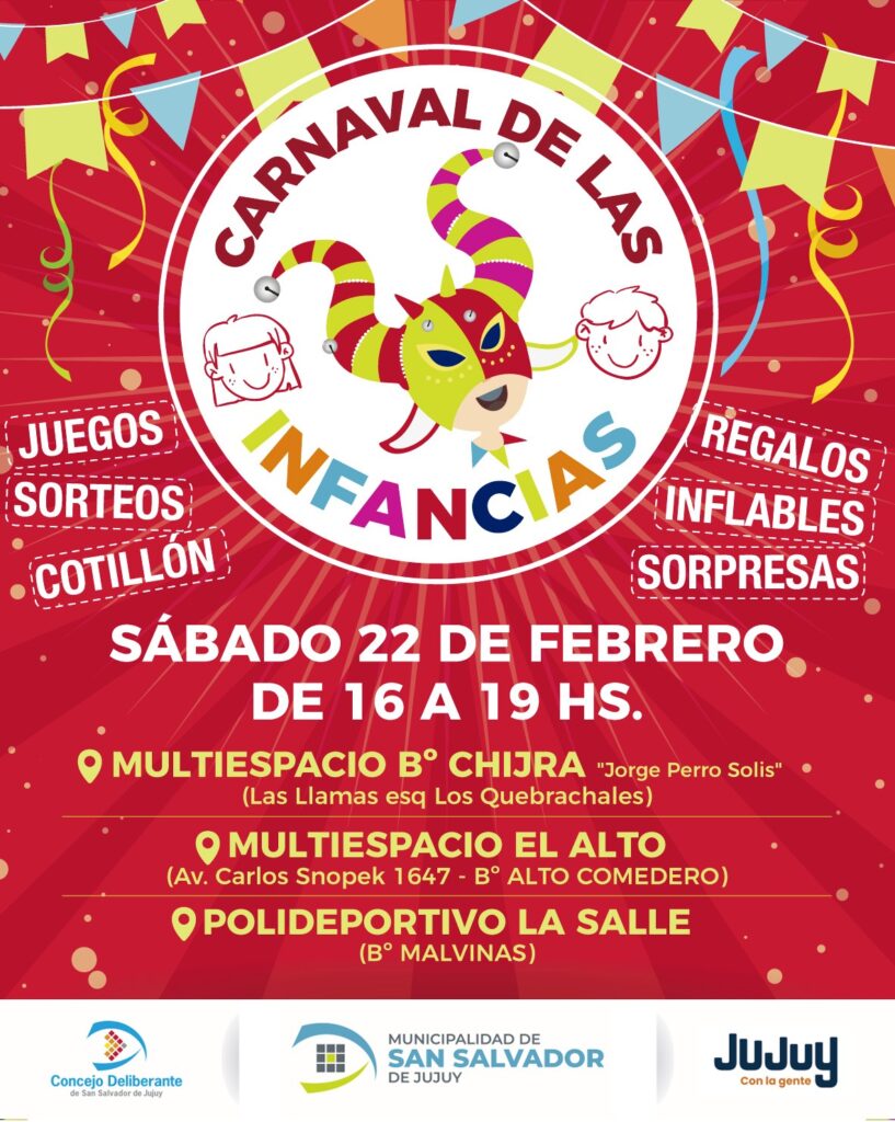 La Municipalidad de San Salvador de Jujuy invita a todas las familias a disfrutar de una nueva edición del “Carnaval de las Infancias”, un evento pensado especialmente para los más pequeños. La celebración se llevará a cabo el sábado 22 de febrero, de 16 a 19 horas, en tres puntos de la ciudad: los multiespacios de Alto Comedero y Chijra, y el polideportivo de la Escuela La Salle, en el barrio Malvinas.