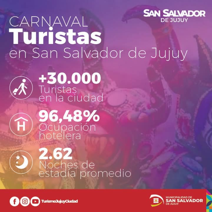 San Salvador de Jujuy ha consolidado su lugar como uno de los destinos turísticos más atractivos de Argentina durante el Carnaval 2025. Con más de 30,000 turistas visitando la ciudad, los números reflejan un crecimiento constante y un fuerte interés tanto de argentinos como de extranjeros por descubrir la riqueza cultural y paisajística de la capital jujeña.