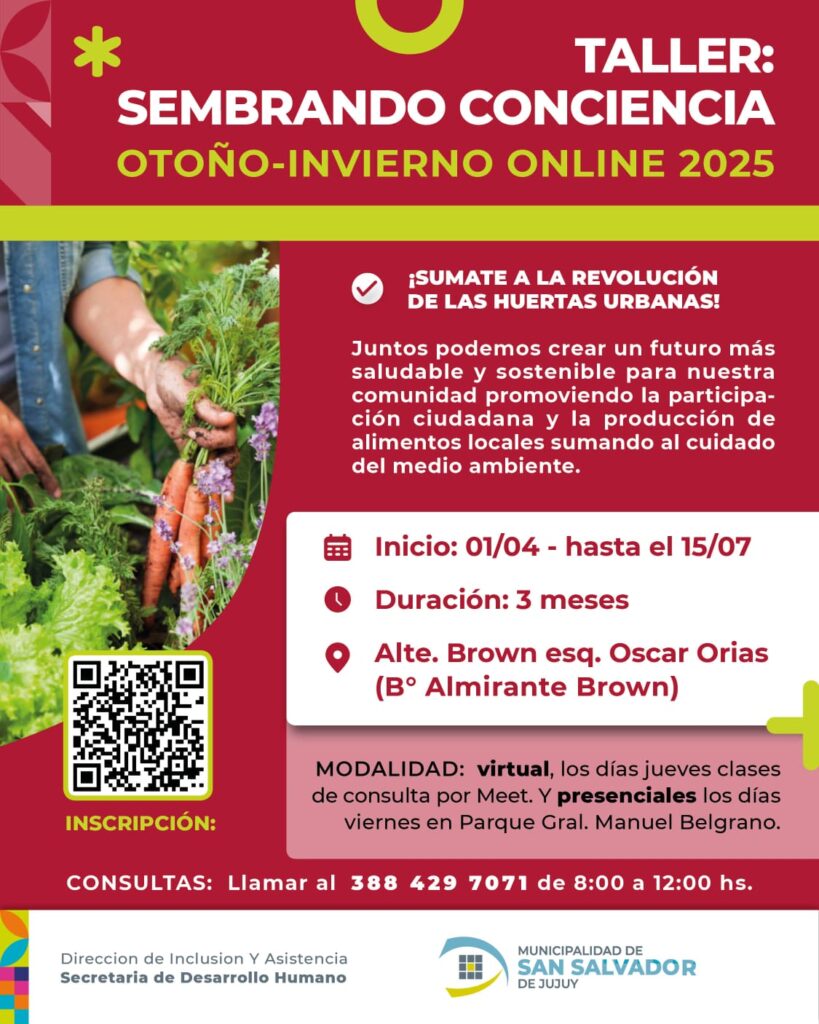 Continúan las inscripciones hasta el miércoles 25 de marzo, para el taller virtual “Sembrando Conciencia”, organizada por la Dirección de Inclusión y Asistencia de la Municipalidad de San Salvador de Jujuy, que tiene como objetivo fomentar la creación de huertas familiares. Los interesados deberán completar el siguiente formulario Google.