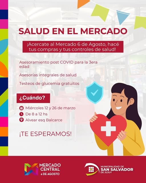 La Municipalidad de la ciudad, invita a la comunidad en general a acercarse al Mercado 6 de Agosto los días miércoles 12 y 26 de marzo, donde podrán aprovechar los servicios y controles gratuitos de salud (glucemia y COVID para la 3ra.edad) que se ofrecerán en el lugar a cargo de un equipo de profesionales del Ministerio de Salud de la Provincia, en el horario de 8 a 12 horas.
