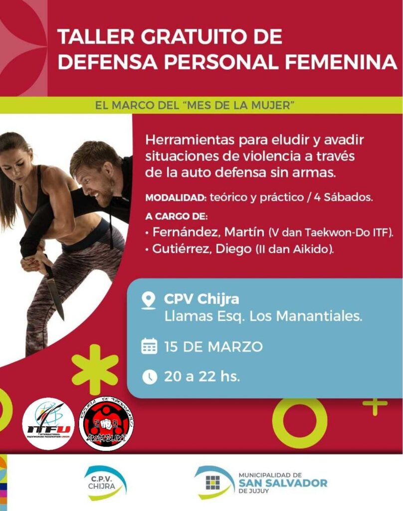 El taller se llevará a cabo en el CPV Barrio Chijra los sábados, de 20:00 a 22:00 horas, con una duración de cuatro sábados y una clase teórico-práctica por semana, e inicia el 15 de marzo. La edad mínima para participar es de 13 años. Los temas que se abordarán incluyen autoprotección, seguridad personal, prevención y más.